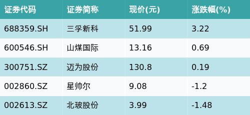 收尾收盘,HJT电板主题涨跌幅最高的五只股票为:三孚新科(688359.SH)、山煤海外(600546.SH)、迈为股份(300751.SZ)、星帅尔(002860.SZ)与北玻股份(002613.SZ)。细目见下表: