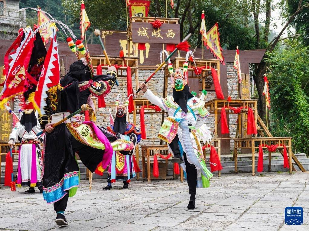 10月24日,地戏艺东说念主在贵州安顺天龙屯堡古镇饰演。