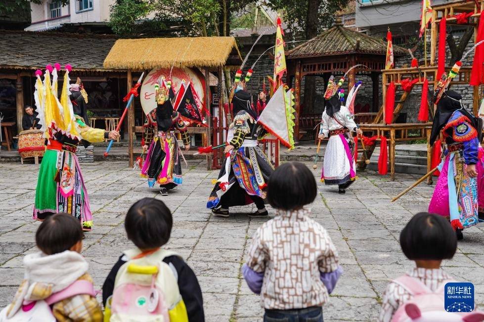 10月24日,孩子们在贵州安顺天龙屯堡古镇不雅看地戏饰演。